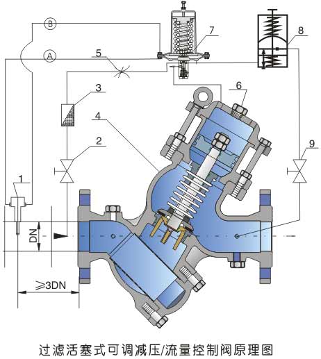 1.畢托管 2.球閥 3.過(guò)濾器 4.主閥 5.針閥 6.開(kāi)度指示器 7.限流導(dǎo)閥 8.減壓導(dǎo)閥 9.球閥