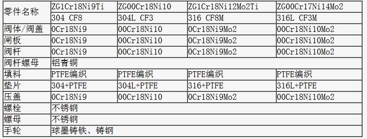 二、Z41W-16P(R) Z41W-25P(R) Z41W-40P(R) Z41W-64P(R)不銹鋼閘閥的主要零件材質(zhì):