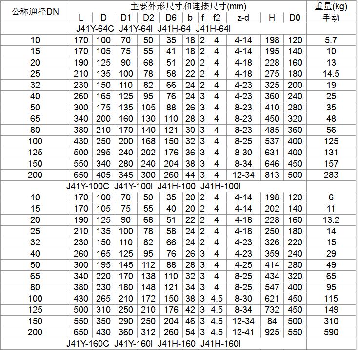 九、J941Y-64型、J941Y-100型J941Y-160型主要尺寸及重量